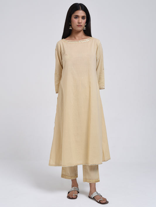 Chamki Beige Cotton Gota Patti Kurta, Pants & Dupatta
