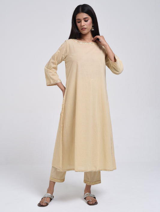 Chamki Beige Cotton Gota Patti Kurta, Pants & Dupatta