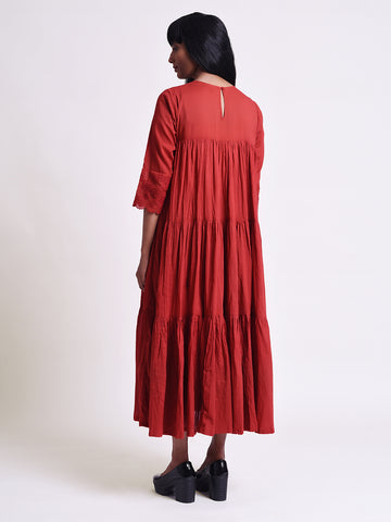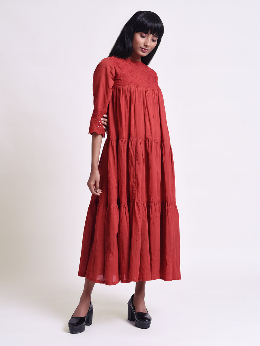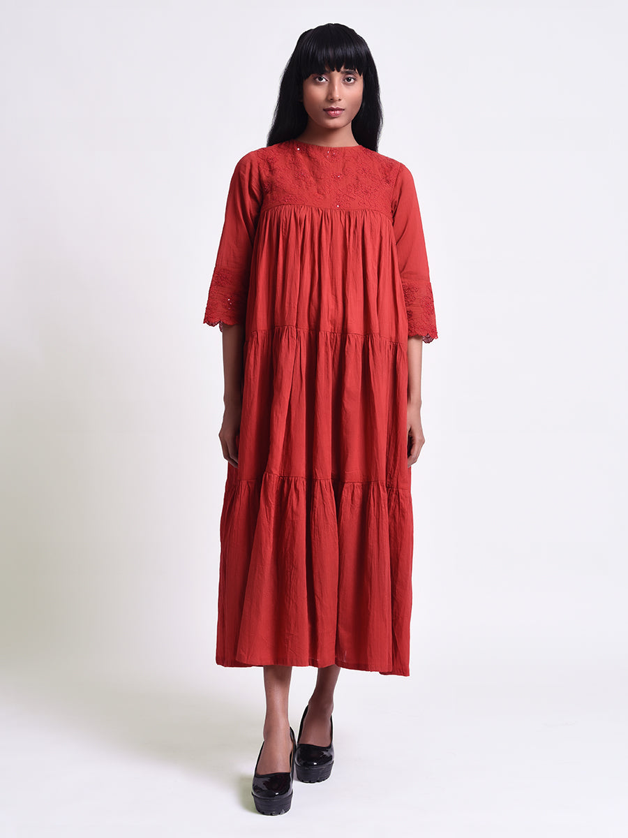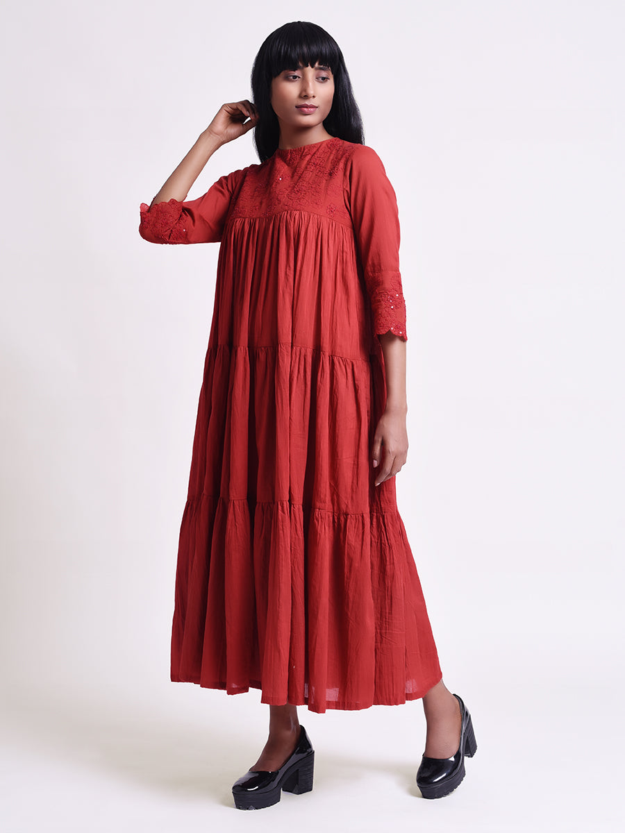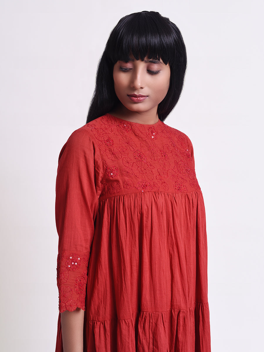 Anurakti's Yok Kurta is a classic, red cotton dress that features beautiful, textured embroidery on the yok and sleeve, complemented with beads and shimmering sequin work. It's a timeless piece perfect for any occasion.