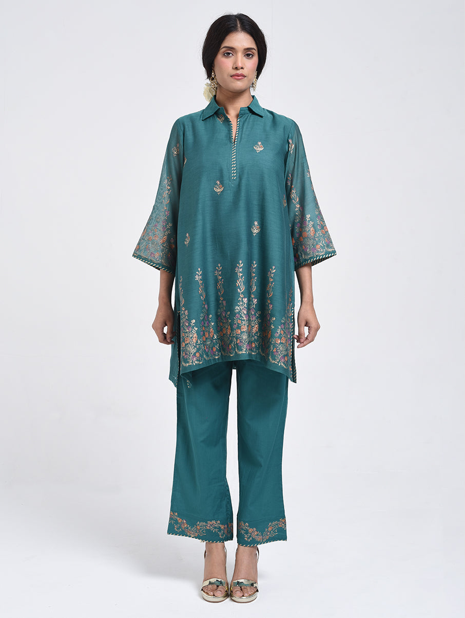 Gudhal Teal Cotton Silk A line Kurta with Pants