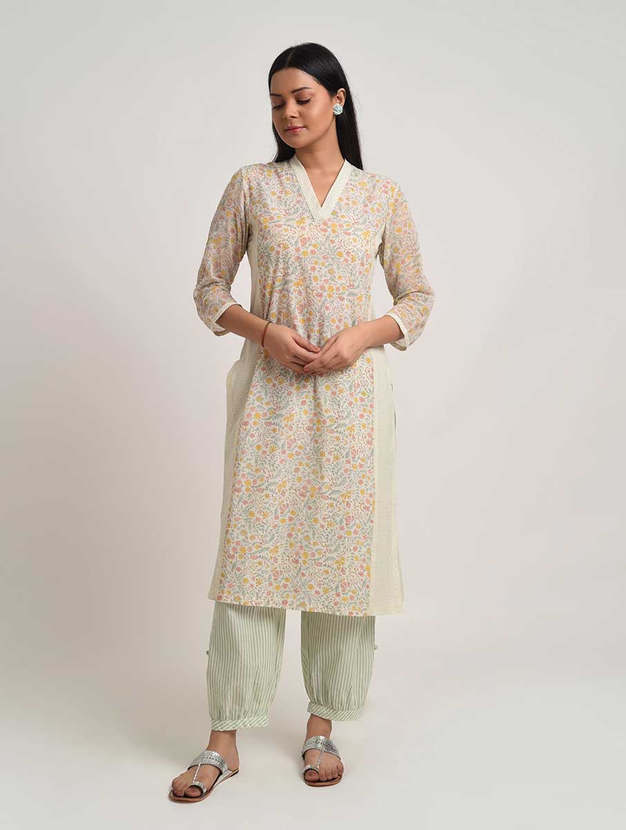 Crafted in soft, breathable cotton, this hand block print Anarkali kurta features a pastel multicolour floral design that feels fresh, light, and timeless. Each motif is meticulously hand-printed by skilled artisans, making every piece unique. The gentle colour palette and natural fabric offer all-day comfort while reflecting the beauty of traditional Indian craftsmanship.