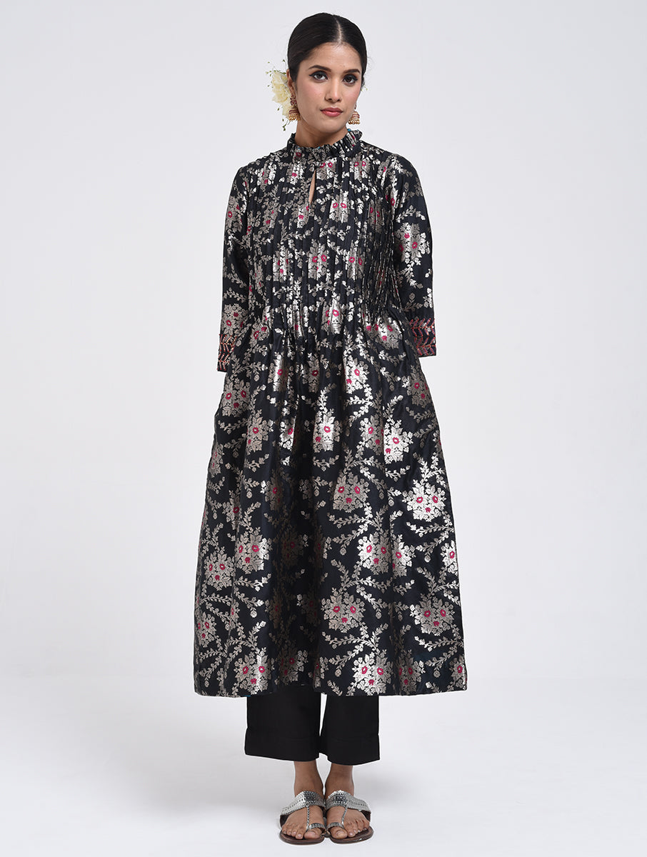 An elegant Black silk brocade kurta adorned with intricate floral patterns, paired with a soft cotton satin pant for all-day comfort. A timeless festive ensemble blending traditional craftsmanship with modern sophistication.