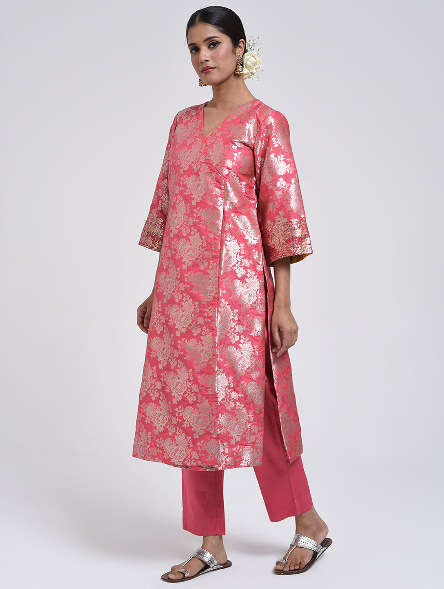 An elegant Pink silk brocade kurta adorned with intricate floral patterns, paired with a soft cotton satin pant for all-day comfort. A timeless festive ensemble blending traditional craftsmanship with modern sophistication.