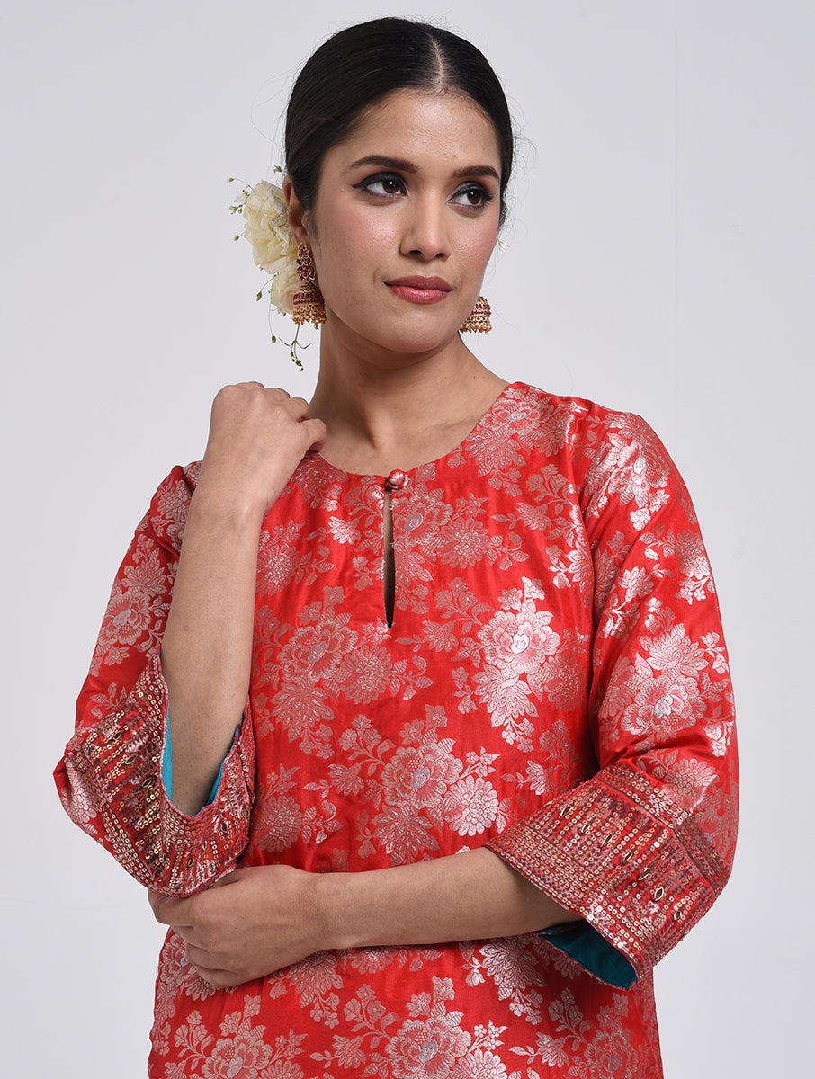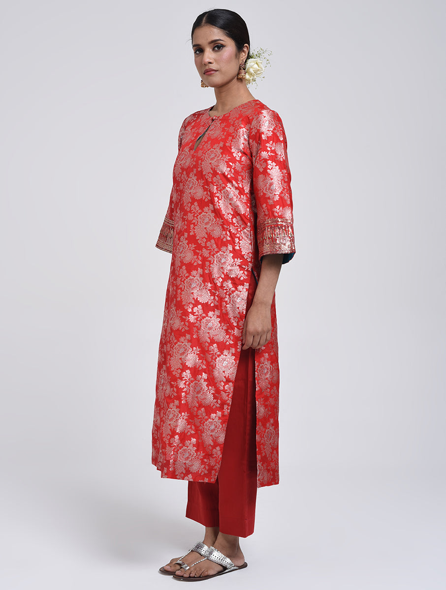 An elegant Red silk brocade kurta adorned with intricate floral patterns, paired with a soft cotton satin pant for all-day comfort. A timeless festive ensemble blending traditional craftsmanship with modern sophistication.