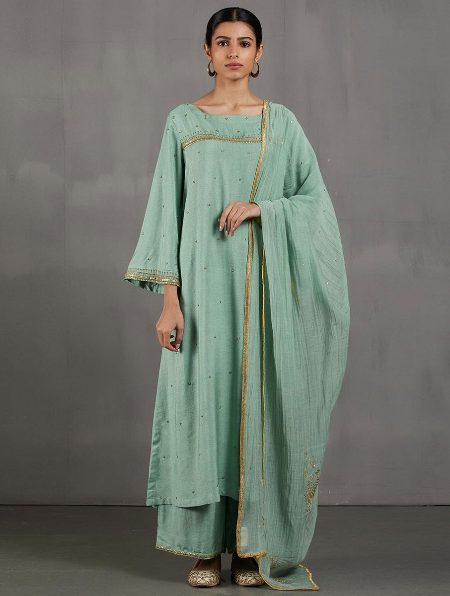 This Noori Boat Neck Kurta set is crafted with a feature tasar cotton hand embroidered kurta, cotton tasar pajama, and delicate scalped dupatta with intricate zari embroidery. Perfectly tailored for that elegant and timeless look.