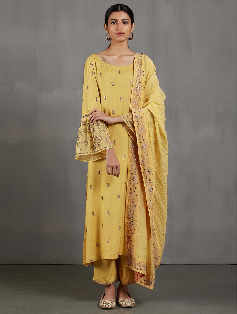 This Noori Round neck Kurta set is crafted with a feature tasar cotton hand embroidered kurta, cotton tasar pajama, and delicate scalped dupatta with intricate zari embroidery. Perfectly tailored for that elegant and timeless look.