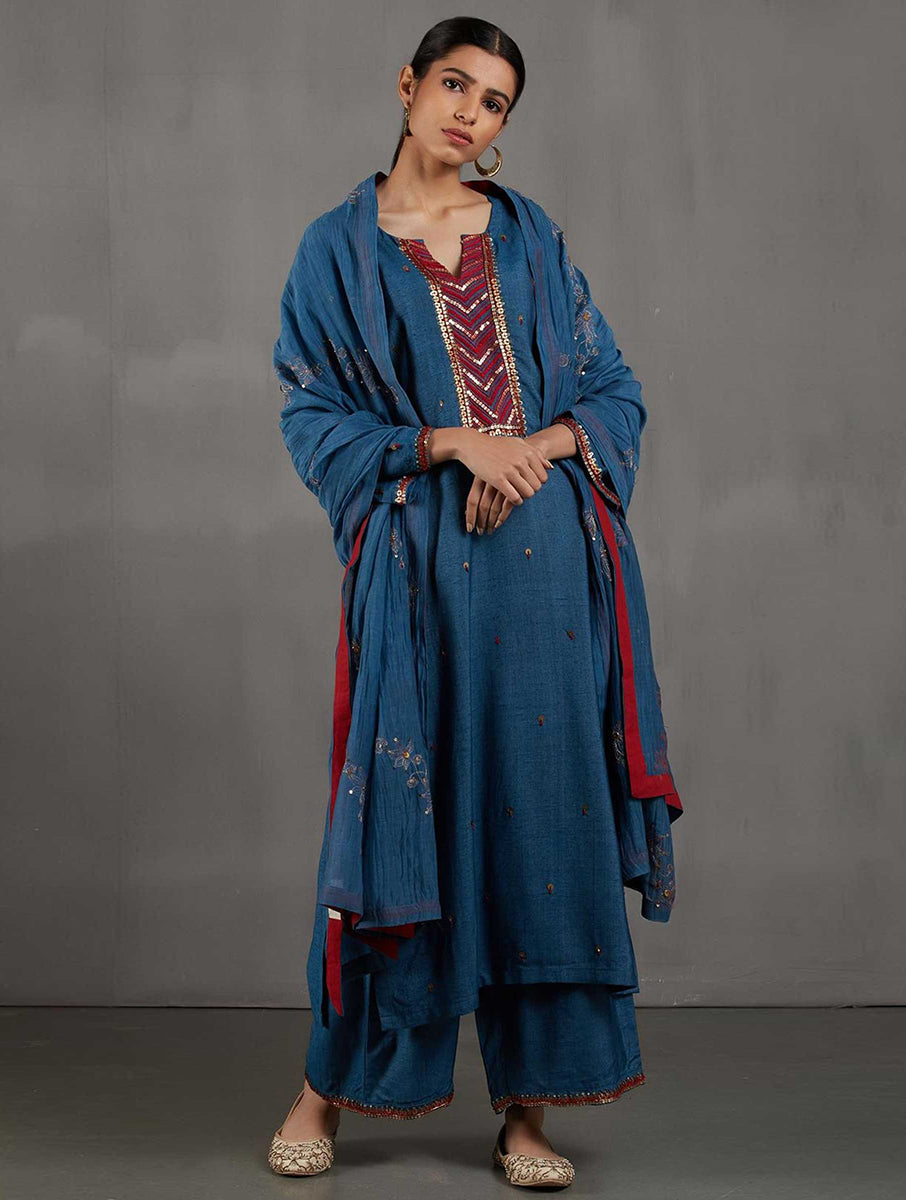 This Noori Round Neck Kurta set is crafted with a feature tasar cotton hand embroidered kurta, cotton tasar pajama, and delicate scalped dupatta with intricate zari embroidery. Perfectly tailored for that elegant and timeless look.